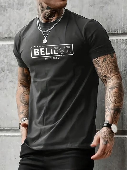 "Always Believe In Yourself" Print T-shirt, Men's Casual Street Style Stretch Round Neck Tee Shirt For Summer