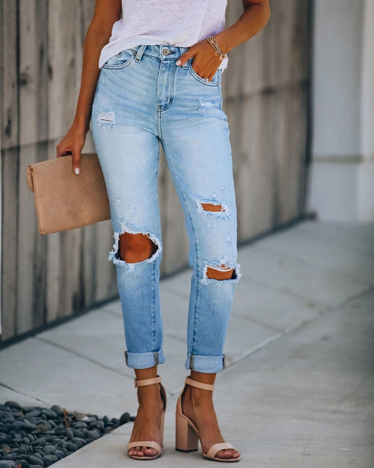 Europe and the United States cross-border autumn and winter new women's broken hole high waist stretch slim fashion jeans women's foot pants