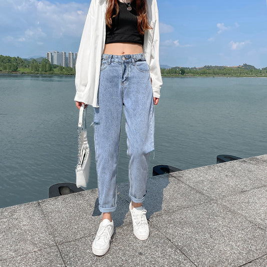 High waist hole jeans female loose nine minutes, 2021 new slim radish old man straight small children