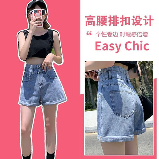 Cotton 2021 new high waist cowboy short pants female ultra-high waist loose thin summer INS roll A word wide leg pants