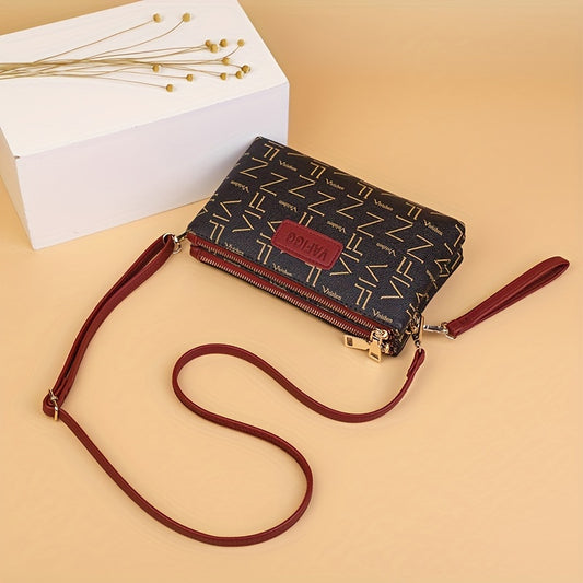 Letter Print Crossbody Bag, Double Zipper Clutch Purse, Women's Faux Leather Handbag With Wristlet