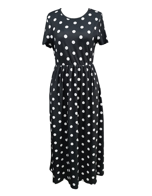 Leisure And Elegant Polka Dot Round Neck Short Sleeved Waistband Dress