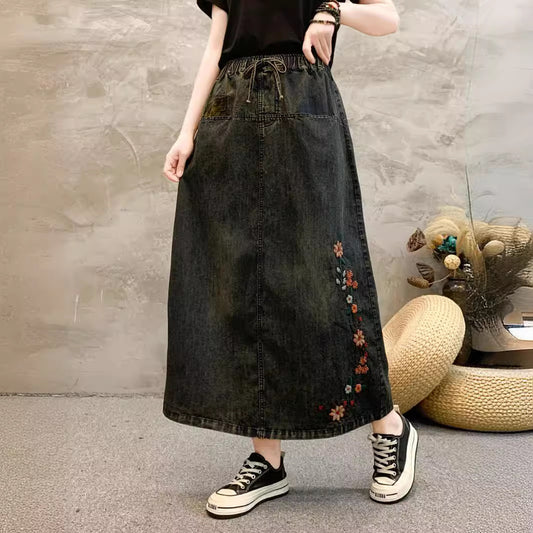 Spring Chinese Style Small Flower Embroidery High-waisted Skirt