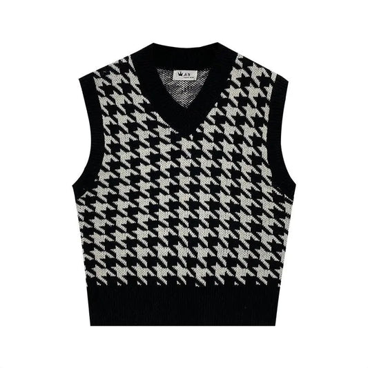 Hnewly Women Sweater Vest Autumn Houndstooth Plaid V-neck Sleeveless Knitted Vintage Loose Oversized Female Sweater Vest Women Clothing
