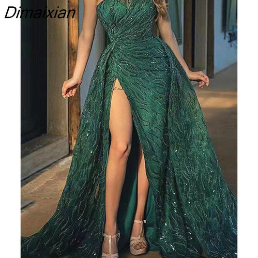 Dimaixian Women Fashion Sequin Off Shoulder High Split Dresses Female Inclined Shoulder Maxi Dress Lady Backless Party Evening Long Dress