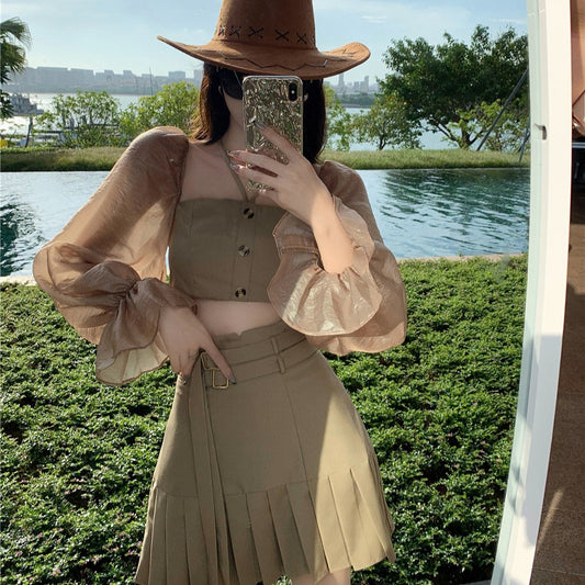 Real shot hot girl skirt autumn retro high waist thin pleated skirt double belt khaki skirt children P245