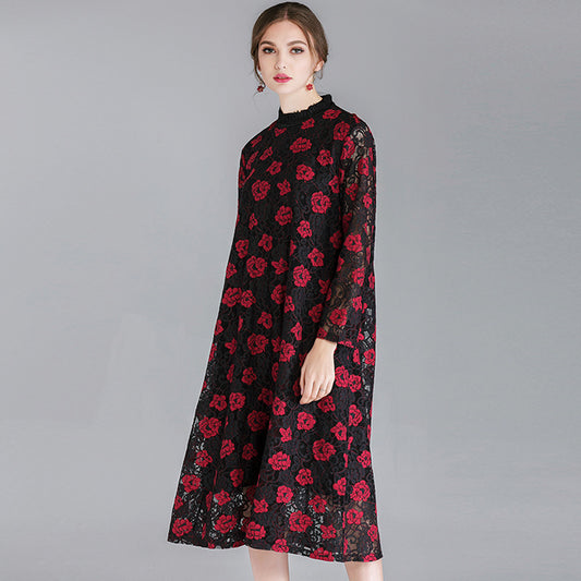 Fat mm2022 large size women's spring clothing new red festive small stand collar contrast color thin lace dress 7139