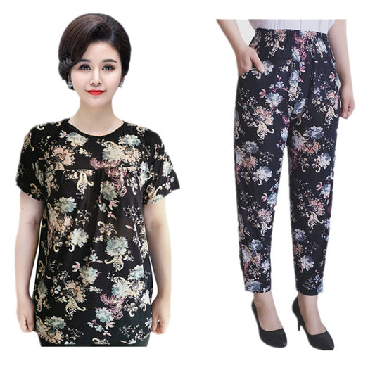 Summer ice silk short sleeve set middle-aged women's mother loose large size thin section flexible multi-color home two-piece