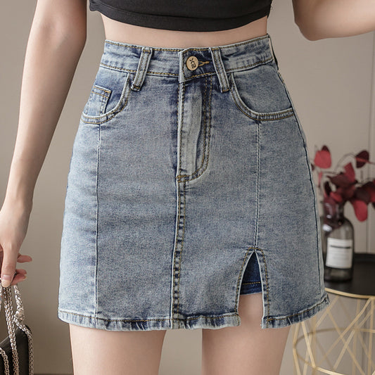 Cowboy half-length skirt female summer thin 2021 new high waist anti-lighting net red A word short pants skirt open bag hip skirt