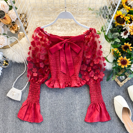 Spring and summer new girl court wind shawl super fairy sweet three-dimensional mesh shoulder bubble sleeve short small shirt tide