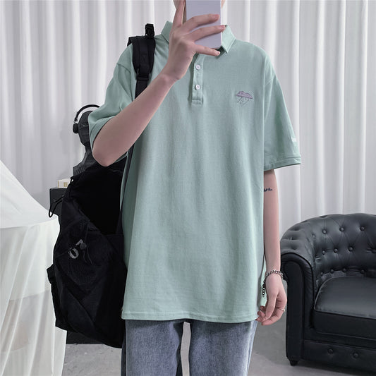 Perth T-shirt men's short sleeves lapel youth loose large size top shirt summer five-point sleeve embroidery top