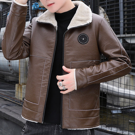 2021 autumn and winter new plus velvet leather men's lapel casual jacket men's handsome locomotive fur integrated leather