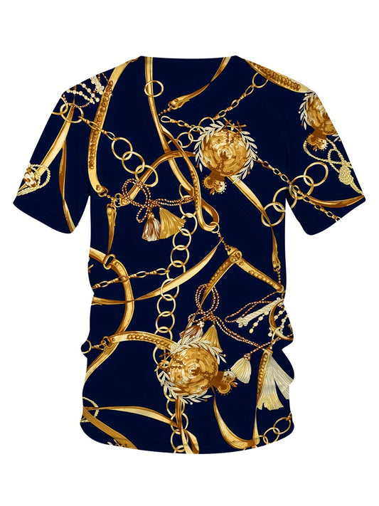 Baroque Style Golden Chain Pattern Print Men's T-shirt, Graphic Tee Men's Summer Clothes, Men's Outfits