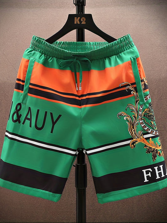 Graphic Pattern Letter Print Striped Quick Drying Beach Shorts, Men's Casual Waist Drawstring Shorts For Summer Resort
