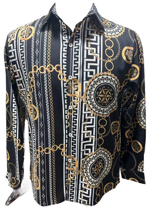 Graphic Print Elegant Shirt, Men's Casual Button Up Long Sleeve Shirt For Summer Fall Business Beach Resort