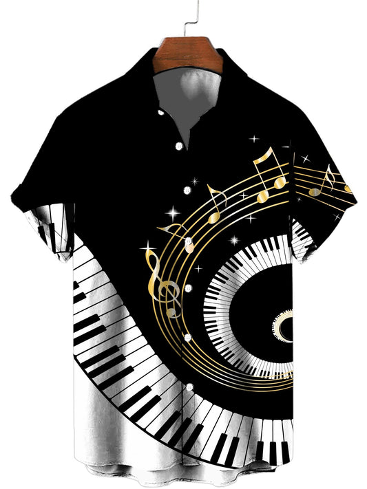 Men's Piano Music 3D Print Fashion Short Sleeve V-neck Button Down Shirts, Men's Summer Clothes, Casual Graphic Tops, Men's Novelty Pajamas Tops
