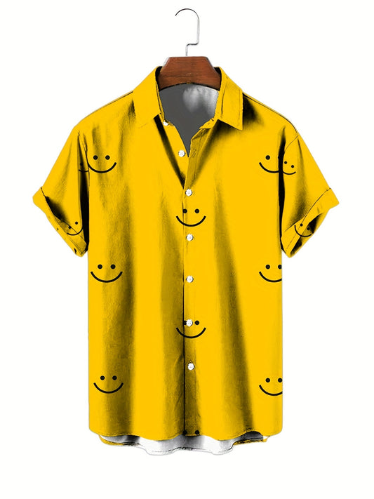Men's Smile Face 3D Print Fashion Short Sleeve V-neck Button Down Shirts, Men's Summer Clothes, Casual Graphic Tops, Men's Novelty Pajamas Tops
