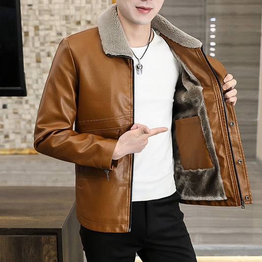 Casual leather men's spring and autumn, winter 2021 new handsome lapel jacket plus velvet thick paragraph warm and handsome jacket