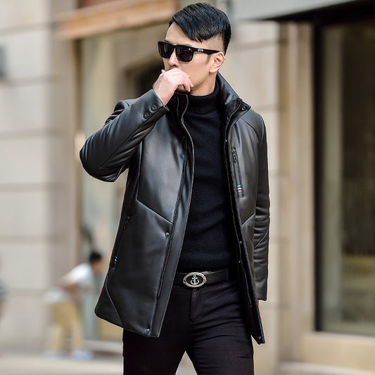 New Haining leather down jacket men's long section youth collar slim casual skin coat warm standing