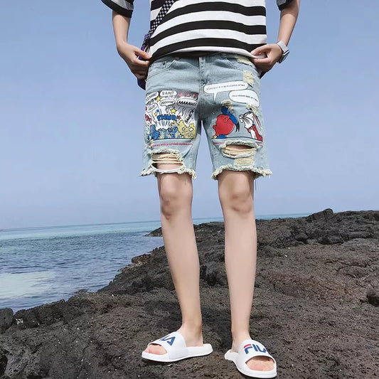 Summer cartoon new men's loose hole five pants Korean version of the trend jeans student short pants uzlang
