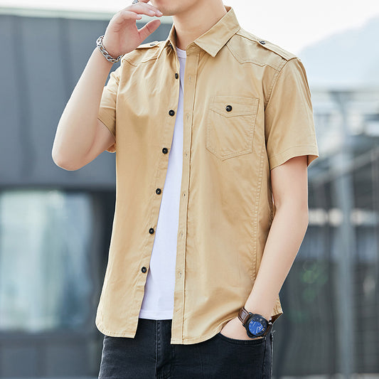 2021 new summer short sleeve tooling shirt men's large size loose solid color youth cotton men's shirt cross-border