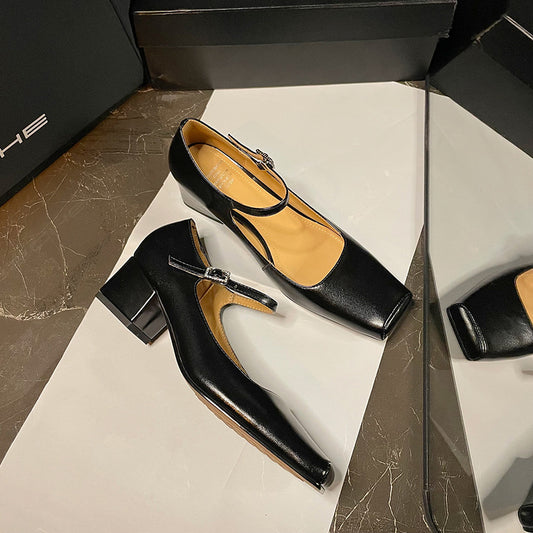 Authentic Leather Toe Box Women's Flat Shoes Back Strap Square Head