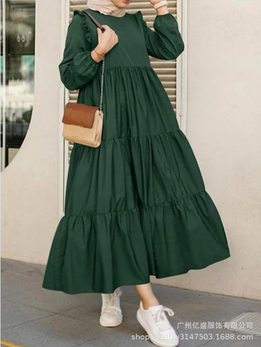 2021 Muslim new lots of fallen leaf sleeves pleated under the pure color round neck long women's large swing dress