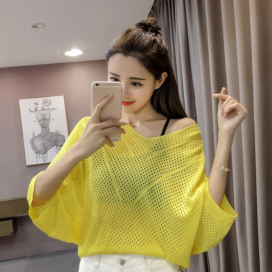 19 spring and summer new hollow sweater bat sleeve loose knit tops V-neck solid color coat large size women's cover shirt