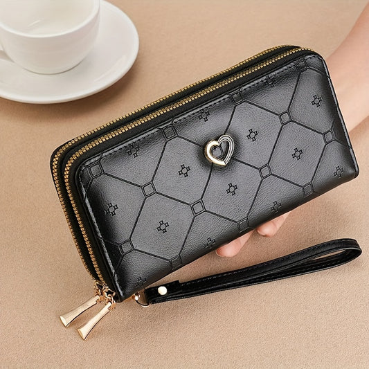 Women's Wallet With Double Zippers, Large Capacity Classic Fashion Clutch Wallet, Solid Color With Geometric Pattern Purse