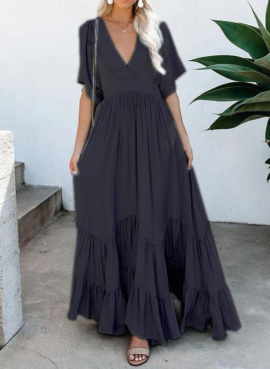 Geumxl New Summer Fashion Maxi Dress V-Neck Short Sleeve Solid Color Floor Length Dress A-Line Holiday Overall Vestidos Boho Robes
