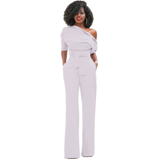 Women Single Shoulder Long Sleeve Beads Design Solid Color Jumpsuit