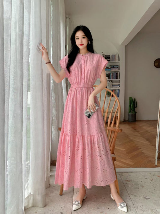 Retro Short Sleeve Round Neck Single-breasted Hollow Embroidery Dress