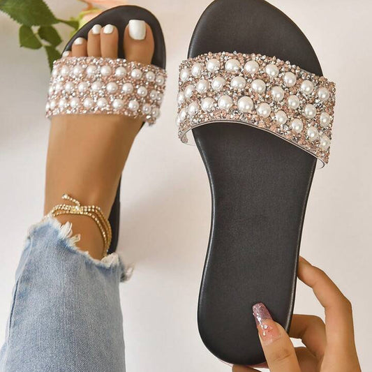 Women's Faux Pearl Decor Slide Sandals, Casual Open Toe Flat Summer Shoes, Lightweight Slide Sandals