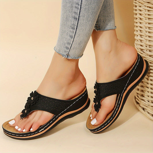 Women's Flowers Decor Flip Flops, Solid Color Soft Sole Wedge Slide Sandals, Casual Summer Outdoor Slide Shoes