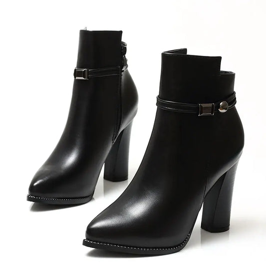 Women 7CM/9CM High Heel Pointed Toe Ankle Boots Fashion Zipper Dress Boots Short Plush Winter Black Split Leather Shoes G0000