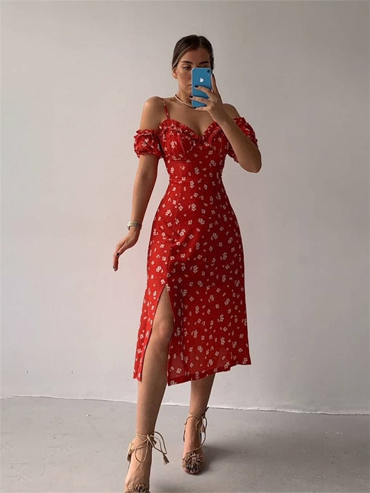 Fashionkova Women’S Off Shoulder Frilly Suspender Dress Party Summer Ladies Short Sleeve V-Neck Split Mid-Length Dress Floarl A-Line