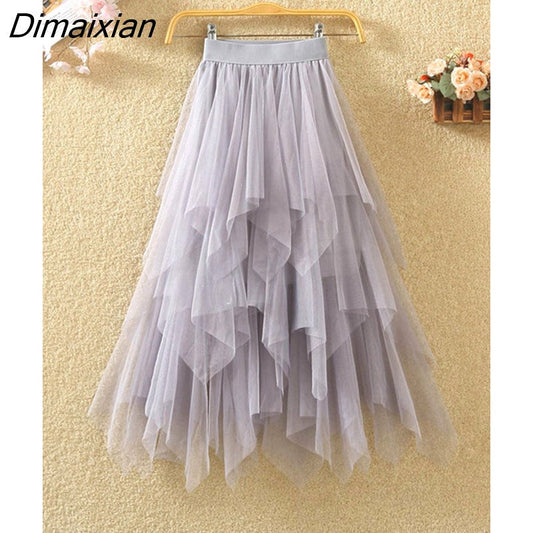 Dimaixian Women irregular Tulle Skirts Fashion Elastic High Waist Mesh Tutu Skirt Pleated Long Skirts Midi Skirt Saias Faldas Jupe Femmle