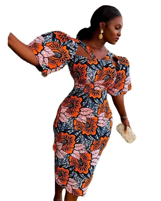 2023 Polyester African Dresses for Women Summer African Women Half Sleeve Printing Knee-length Dress African Print Dresses