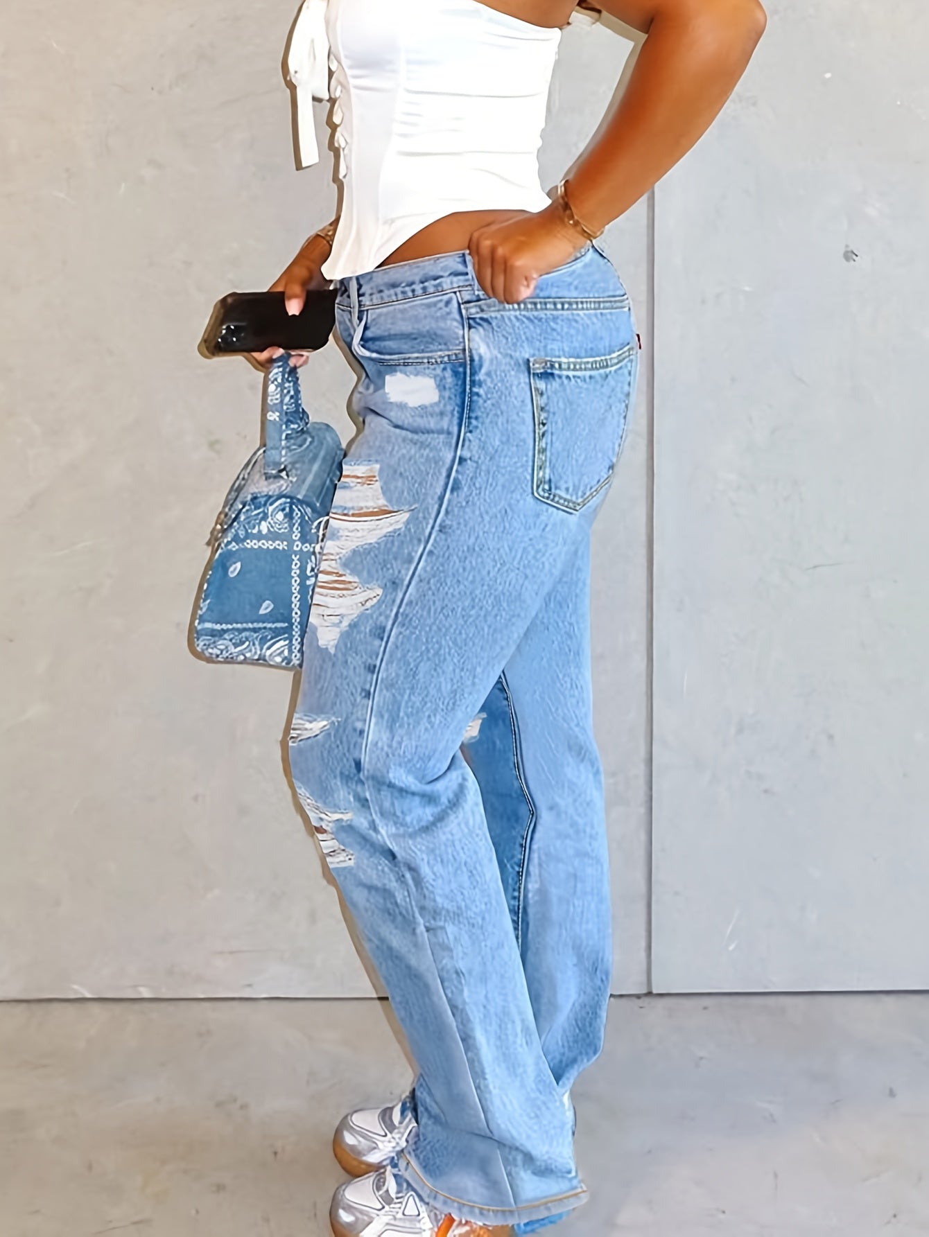 Jeans Dritti Strappati E Consumati, Vestibilità Ampia, Blu Lavato, Pantaloni In Denim Streetwear, Jeans E Abbigliamento In Denim Da Donna