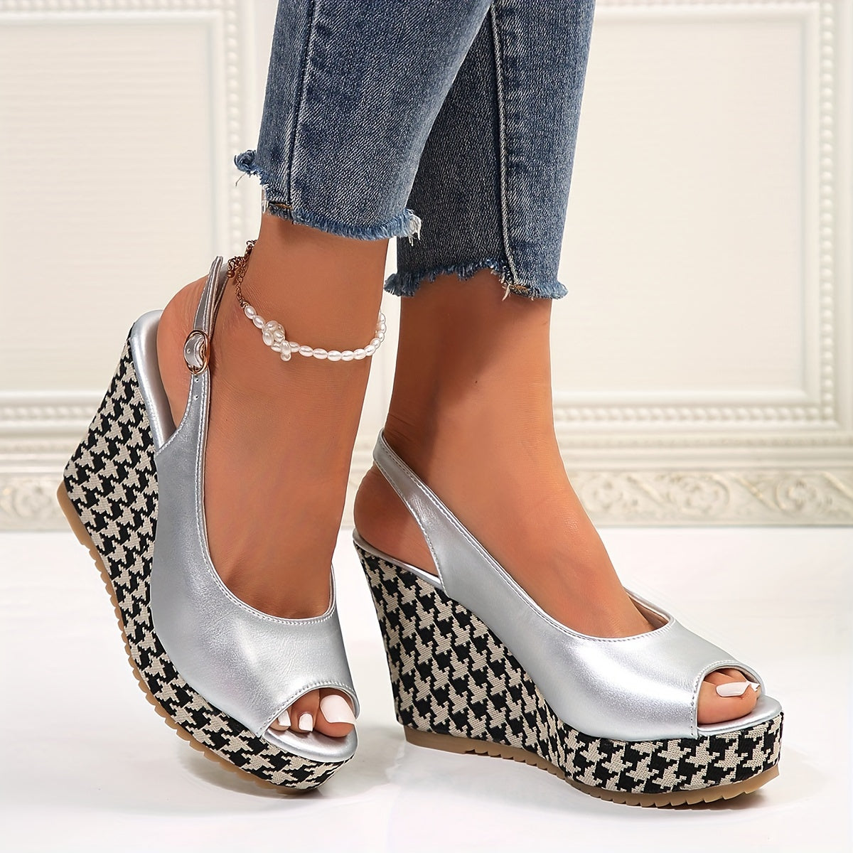 Platform Wedge Houndstooth Sandals, Solid Color Peep Toe Ankle Buckle Strap Slingback Shoes, Casual Party Sandals