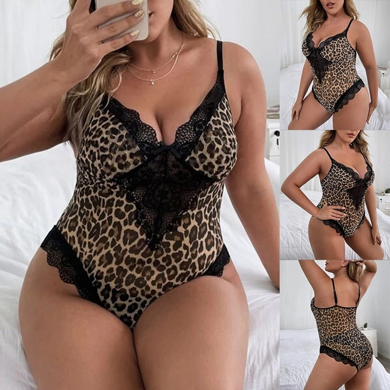 Women Leopard Print Bodysuit One-piece Spaghetti Strap Sleeveless V-neck Lace Hollow Out Sexy Lingerie Plus Size Slim Body Top