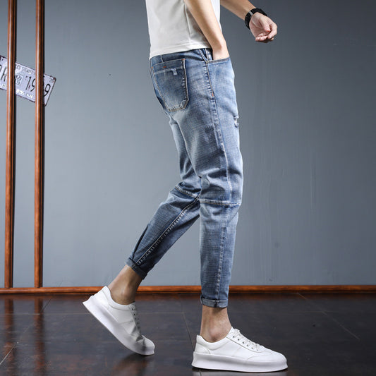 2021 autumn and winter new Korean version of the hip hop trend men's loose comfortable micro-elastic foot nine points denim pants