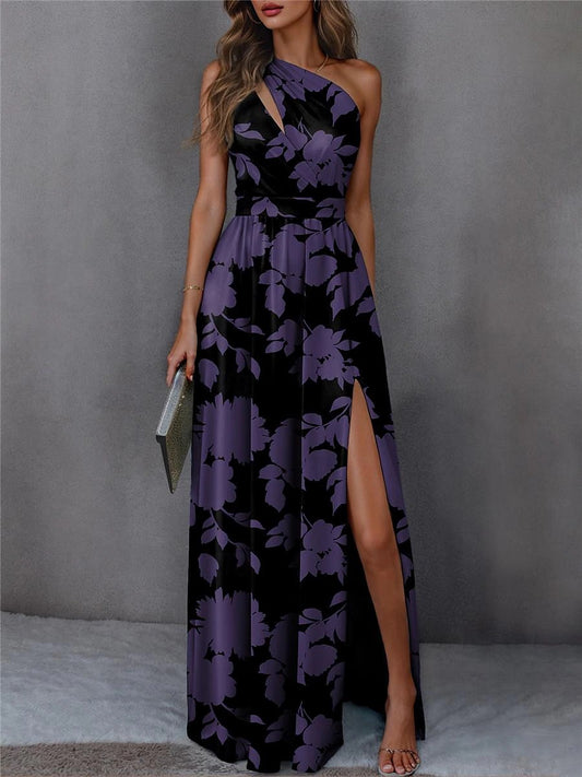 Women's Slant Shoulder Hollow Pleated High Slit Long Dress