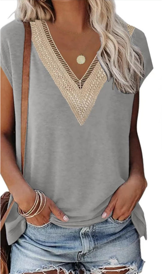 Women's Fashion V-neck Lace Stitching Short Sleeve Casual Loose Top