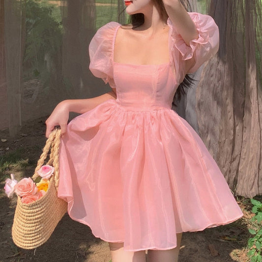 Geumxl Woman Sweet Pink Fairy Dress 2022 Summer Vintage Elegant Square Collar Puff Sleeve Ball Gown Robe Korean Mini Princess Vestidos 0719