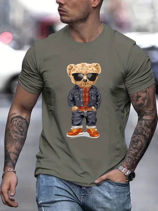 Denim Toy Bear Pattern Men's T-shirt For Summer Outdoor, Casual Male Clothing