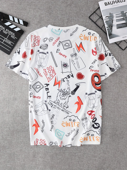 Cartoon Graffiti & Toy Bear Pattern Men's Chic T-shirt For Summer Outdoor