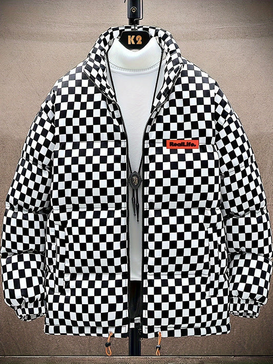 Men's Stylish Checkered Puffer Coat With Pockets, Casual Breathable Stand Collar Zip Up Long Sleeve Warm Top For City Walk Street Hanging Winter Outdoor Activities