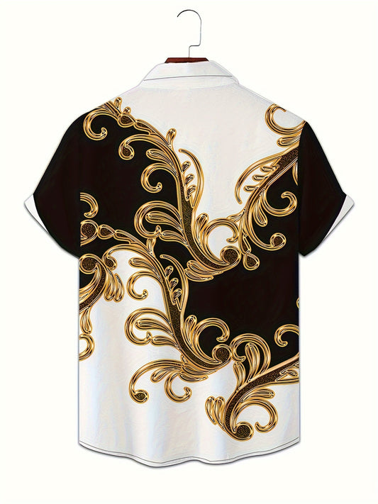 Baroque Floral Print Men's Color Block Short Sleeve Button Down Shirt For Summer, Party Banquet