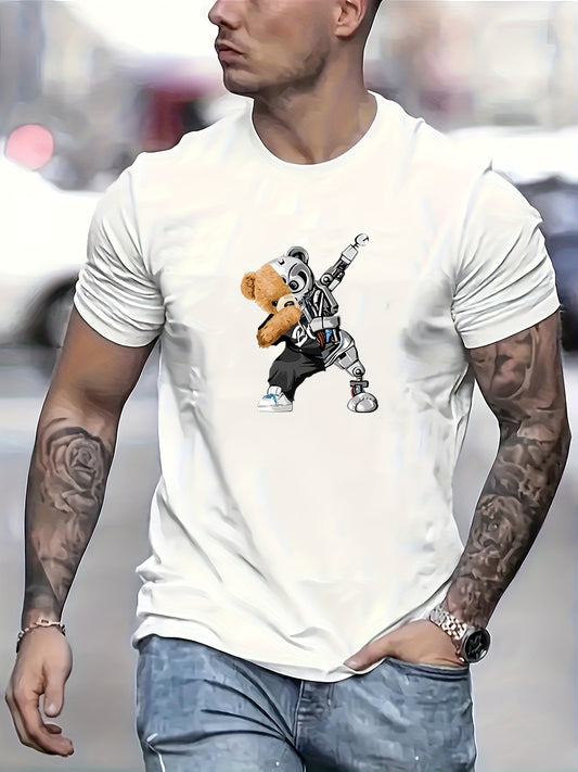 Robot Bear Pattern T-shirt, Men's Casual Street Style Stretch Round Neck Tee Shirt For Summer